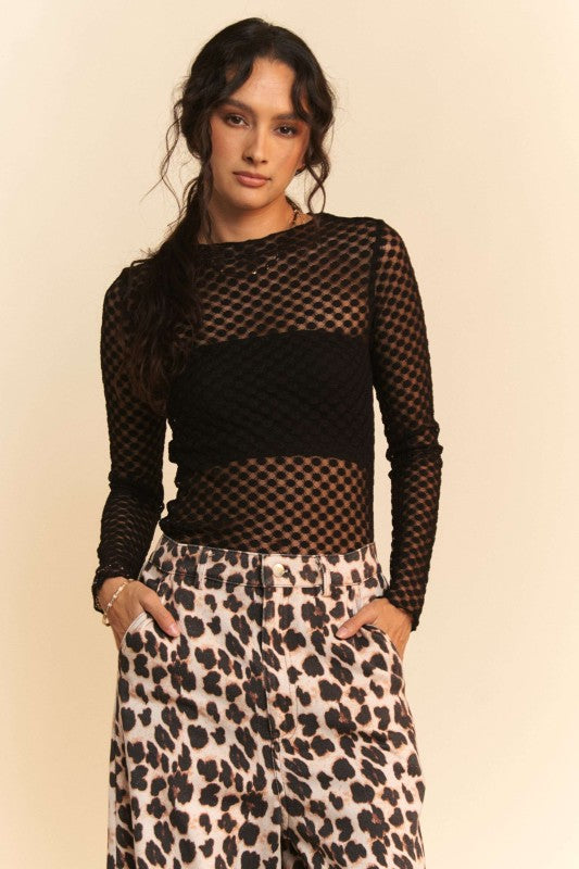 Sheer polka dot mesh top. Designed with long sleeves and a lightweight stretch fit, it layers easily over camis or bralettes for a versatile styling piece. Bralette not included!